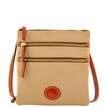 Nylon North South Triple Zip Dooney's Nylon Collection items are lightweight and extremely durable. A more substantial weave provides the extra reinforcement that allows this collection to better maintain profile. High impact hues, shiny gold tone hardware and russet leather trim make this collection the perfect carryall for everyday. Two outside zip pockets. Adjustable strap. Strap drop length: 24 in. Lined. L 8 in. W .25 in. H 8 in. Color: Khaki w Russet trim ... View Details » |