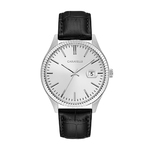 Mens Silver-Tone Black Croc Strap Watch White Dial Elegant and refined with a croc-embossed black leather strapWhite dial with silver-tone hour makers and three handsFeatures minute markers along outer rimDay of the month window with magnifier by 3 positionTextured bezel detailSilver-tone stainless steel caseback and bezelTraditional buckle closureCase diameter: 41mmCase thickness: 9.1mmWater resistant to 30 M3-Year manufacturer limited warranty ... View Details » |