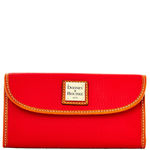 Signature Snap Flap Wristlet Carry your basics in style with this attractive wristlet made in Dooney's Signature Fabric with leather trim. Dooney and Bourke heart fob. Snaps shut. Detachable wristband. L 6.25 in. W 1.5 in. H 4 in. Color: Red with Brown trim ... View Details » |