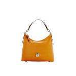Saffiano Hobo Crisp clean lines of timeless design catches the eye first. A stunning array of rich hues lures one further. Then, the delicate Saffiano texture coupled with contrasting russet leather trim, off-white topstitching, and simple gold tone hardware completes this perfect mixture of tailored, subtle beauty. Two inside pockets. Inside zip pocket. Cell phone pocket. Inside key hook. Strap drop length: 8 in. Lined. Zipper closure. L 12.5 in. W 5.5 in. H 10.75 in. Color: Natural ... View Details » |