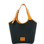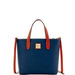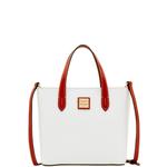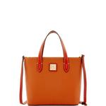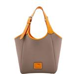 Patterson Penelope The chic silhouette of Dooney's Penelope bag gives it a style all its own. Bright pebbled leather, biscuit tan trim and silver Palladium hardware create a fresh take on a classic Dooney look. Oversized buckles and grommets on the handles are both fun and practical. Add a Penelope to your wardrobe and prepare to turn heads wherever you go. Features include two inside pockets, one inside zip pocket, cell phone pocket, inside key hook. Handle drop length 10 inches. Top zip closure. Lined. Feet. Me ... View Details » |
