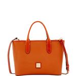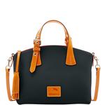 Patterson Trina Satchel The Patterson Trina Satchel updates one of Dooney's favorite satchel shapes with pebbled leather, biscuit-colored trim, silver Palladium hardware and a new logo patch. Stand out features include leather top handles, with belt-like buckles to customize the length, and a double tassel zipper pull. A detachable shoulder strap provides a second carry option and brass feet protect the underside. Other features include two inside pockets, one inside zip pocket, and an inside key hook. Strap drop lengt ... View Details » |