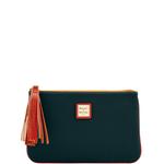 Pebble Grain Carrington Pouch Furnished with credit card slots and an inside pocket, this compact carry pouch can easily transport a cell phone, compact and keys for a night out, a quick errand, or within a larger travel bag. Durable, pebbled leather, a signature logo stamp and a preppy tassel convey Dooney and Bourke's classic aesthetics. Measures H 6 in x W 9.5 in x D .5 in. Color: Black ... View Details » |