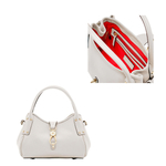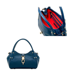 Belvedere Small Logo Lock Satchel Unstructured shapes and tumbled, pebbled leather give a visual and tactile softness to this modern, compact satchel. A refined, jewel-inspired lock adorns this design, while keeping your essentials secureârefined style. Features include double handles, logo lock closure, adjustable side buckles, four bottom feet, goldtone hardware, inside slip pocket, cell phone pocket, one inside zip pocket, and an internal key hook. 5 inch handle drop. Measures H 4.5 in x W 10 in x D 7 in. Color: Red ... View Details » |