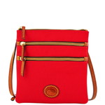 Nylon North South Triple Zip Dooney's Nylon Collection items are lightweight and extremely durable. A more substantial weave provides the extra reinforcement that allows this collection to better maintain profile. High impact hues, shiny gold tone hardware and russet leather trim make this collection the perfect carryall for everyday. Two outside zip pockets. Adjustable strap. Strap drop length: 24 in. Lined. L 8 in. W .25 in. H 8 in. Color: Red with Russet trim ... View Details » |