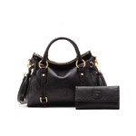 Florentine Small Satchel and Checkbook Organizer (2pcs) A sophisticated set of Dooney's Florentine Collection. Florentine Small Satchel and Checkbook Organizer. Satchel: Double handles with 4.5 in. drop. Fold-over zipper closure. Lined with feet. One inside zip pocket. Two inside pockets. Cell phone pocket. Detachable strap drop: 19 in. L 13 in. W 5.75 in. H 8 in. Clutch: Outside zip pocket. Two inside pockets. Two bill compartments. License window. Seven credit card slots. Lined. Snap closure. L 7.5 in. W 1.25 in. H 4 in. Color: Black w Black Trim ... View Details » |