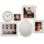 Gallery Clock/Mirror/Picture Frame Combo Clock Mirror and Picture framesAntique white finish4 Separate photo frames3D Nail head design hour markersRequires 1 AA battery (NOT included)Dimensions: 30.5âW x 0.5âD x 22âH ... View Details » |