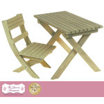 The Queen's Treasures Gombe Rainforest Table & Chair Set for 18" Doll Girl In 1960, Dr. Jane Goodall, DBE, UN Messenger of Peace and founder of the Jane Goodall Institute, started her pioneering research on wild chimpanzees in what is now Tanzania’s Gombe National Park. She worked and ate at a set reminiscent of this one, scaled for 18" doll play. Broad surface has plenty room for research tools at just the right height for 18" dolls. Sturdy plank table and matching chair fold flat for travel and storage. Table measures 11"L X 6 1/2"W X 8 3/8& ... View Details » |