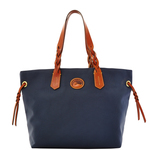 Nylon Shopper Dooney's Nylon Collection items are lightweight and extremely durable. A more substantial weave provides the extra reinforcement that allows this collection to better maintain profile. High impact hues, shiny gold tone hardware and russet leather trim make this collection the perfect carryall for everyday. Snap closure. Lined. Inside zip pocket. Inside snap pocket. Cell phone pocket. Inside key hook. Strap drop: 10 in. L 12.5 in. W 6.75 in. H 11.25 in. Color: Navy w Russet trim ... View Details » |