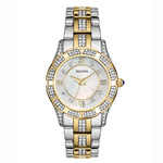 Womens Crystal Two-Tone Bracelet Mother of Pearl Dial Gold and silver tone stainless steel braceletWhite mother of pearl dial with 8 crystal stone markersGold tone stainless steel case with crystal accentsRoman numerals mark quarter hoursDouble locking claspMineral crystal windowCase thickness: 6.9mmDiameter: 30.4mmWater resistant to 30 M3 Year manufacturer warranty ... View Details » |