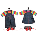 Adorable denim overall skirt, accented with red stitching, and a rainbow striped long sleeve tee will be a hit for every set of Bitty Twins Red tie up shoes also included. Perfect fit for 15" doll like American Girl® Bitty Baby. Attractively packaged in a reusable 15" doll clothes garment bag with doll clothing plastic hanger. Exclusively made by The Queen's Treasures®, offering the highest quality 18” Doll Furniture, 18” Doll Clothes, 18” Doll Shoes & 18” Doll Accessories! Safety Tested!"