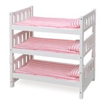 Badger Basket's White Rose 1-2-3 Convertible Doll Bunk Bed with Storage Baskets features two bed configurations for sleepover doll fun! Stack it as a triple doll bunk bed, or convert it to a double bunk and single bed. The lower bunk head- and footboards showcase a silk-screened rose and leaf design bursting with pretty pinks and spring green. For sleepytime comfort, all three beds include a fluffy white padded mat and a white stuffed pillow. In warmer weather, the padded mats can be used beneath your dolls as a mattress. In winter, use the padded mats as thick blankets on top of your dollies! Three white, removable baskets tuck neatly under the bed for storing everyone's pajamas and small things. The baskets will fit under the single bed, which is on the bottom of the triple stack, and they also fit under the double bed when it's removed from the single. Quickly grab the baskets to peek inside using the convenient handles on the front. Baskets can fold flat for storage (remove the bottom panel, and fold the basket body). Fits 18 inch dolls such as American Girl, Madame Alexander, Our Generation, and My Life As. This bunk bed is so pretty, your stuffed animals will be begging to nap here, too! Fun for little mommies caring for their pretend, tired children. No tools needed to convert from triple bed to single/double bed. Designed for dolls up to 20 inches. Bed is made with durable wood composite board with a white, painted finish. Removable bedding is made with 100% polyester fabric with 100% polyester fill. Baskets are made with non-woven fabric and internal cardboard support panels. Overall assembled dimensions (triple bed): 22.25 inches L x 12 inches W x 23.5 inches H. Overall dimensions (double bed): 22-1/8 inches L x 12 inches W x 15-7/8 inches H with 3.25 inch clearance off the floor. Double bed - measuring from top bunk bed platform: 4.25 inches H to top center of end panel and 4.5 inches H to top of corner post. Overall dimensions (single bed): 22 inches L x 11.75 inches W x 8-5/8 inches H with 3 inch clearance off the floor. Single bed - measuring from bed platform: 4.25 inches H to top center of end panel and 4.75 inches H to top of corner post. Clearance between bunks: 6.5 inches H between bottom and middle, 5.75 inches H between middle and top. Interior of beds: 20.75 inches L x 10.25 inches W. Baskets each measure: 6.5 inches W x 10 inches L x 2.75 inches H. Padded Mats each measure: 21 inches L x 10.25 inches W. Pillows each measure: 6 inches L x 4 inches W x 1.5 inches H. Assembled weight: 11 pounds (triple bed with bedding and baskets), 3.75 pounds (single bed-no bedding/baskets), 6.25 pounds (double bed-no bedding/baskets). All measurements approximate. Frame can be wiped clean with a damp cloth and mild soap. Dry thoroughly. Spot clean fabric and baskets as needed with cold water and mild detergent and allow to air dry. Never immerse baskets in water. Adult assembly required. Illustrated assembly manual included. For children from three years old and up. /! WARNING: CHOKING HAZARD - Small parts. Not for children under 3 yrs. This item is to be used with dolls only and is never to be used with real infants or pets. Meets all current, applicable safety standards. This item ships in its original carton which may include a photo of the product. Product includes a limited warranty of 30 Days Parts to the original purchaser. Dolls and accessories shown in the photos not included. Actual product may vary slightly from shown and described.