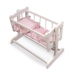 Settle your doll into Badger Basket’s Cuddles Rocking Doll Bassinet and quietly rock your fussy little one to sleep. With a gentle push, this adorable, oval doll bassinet effortlessly sways on the curved rocker base as your little mommy comforts her drowsy dolly with a lullaby. Realistic-looking, dome canopy can be folded flat. Spacious, quilted interior has a lightly padded bottom. Floor-length, pleated skirt surrounds the white, metal frame. The long, flowing skirt cleverly conceals a handy storage basket! Mesh basket organizes all of your doll’s diaper changing supplies, small clothes, and other little mommy must haves. Playtime with the Cuddles Doll Bassinet encourages nurturing, empathy, and social skills. Also makes a precious place to display prized collector dolls, such as reborn baby dolls. Bassinet frame is made with powder-coated steel metal tubing, PP plastic, and engineered wood. Bedding fabric is 100% polyester with 100% polyester fill. Storage basket fabric is 100% polyester. For dolls up to 20 inches. Fits 18 inch dolls such as American Girl, My Life As, Madame Alexander, and Our Generation; and also fits 15 inch American Girl Bitty Baby dolls and 14.5 inch American Girl WellieWishers dolls. Overall doll bassinet measures: 23 inches L x 11.75 inches W x 24 inches H. Interior of bassinet: 22 inches L x 10.5 inches W x 6 inches H. Storage Basket (at bottom ): 10 inches L x 9 inches W x 3 inches H. Storage Basket (overall ): 14 inches L x 9 inches W x 7 inches H. Height from rim to floor: 17 inches H. Height from rim to top of canopy: 7 inches H. Assembled weight: 5.0 pounds. All measurements approximate. Use cold water and mild detergent for any and all cleaning. Wipe the frame clean with a damp cloth dry thoroughly. Liner/Skirt and Storage Basket can be spot cleaned or removed from frame and machine wash, tumble dry low or no heat. Secure all grip tape before washing. Canopy and Padded bottom board can be gently spot cleaned. For children from three years old and up. Adult assembly required (no tools needed). Illustrated instructions included. This item is to be used with dolls only and is never to be used with real infants or pets. /! WARNING: CHOKING HAZARD - Small parts. Not for children under 3 yrs. Product complies with all currently applicable safety standards. Product includes a limited warranty of 30 Days Parts to the original purchaser. Doll and doll clothes/accessories not included. Product may vary slightly from shown and described. Props/accessories shown are for illustration purposes only and are not included with the product. Actual color/finish may vary slightly from screen display. This item ships in its original carton which may include a product photo.
