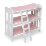 Badger Basket's 1-2-3 Convertible Doll Bunk Bed with Bedding features two bed configurations for sleepover doll fun! Stack it as a triple doll bunk bed, or convert it to a double bunk and single bed. For sleepy time comfort, all three beds are outfitted with a bedding set made of cool and casual pink stripe fabric. Bedding set includes three fluffy padded mats, three single-layer blankets, and three stuffed pillows. This bunk bed is so fun, your stuffed animals will be begging to nap here, too! Fun for little mommies caring for their pretend, tired children. No tools needed to convert from triple bed to single and double bed. Designed for dolls up to 20 inches. Fits 18 inch dolls such as American Girl, My Life As, Madame Alexander, and Our Generation; and also fits 15 inch American Girl Bitty Baby dolls and 14.5 inch American Girl WellieWishers dolls. Doll Bunk Bed is made with durable engineered wood with a white, painted finish. Removable bedding is made with 100% Polyester fabric with 100% Polyester fill. Overall assembled dimensions (triple bed): 22.25 inches L x 12 inches W x 23.5 inches H. Overall dimensions (double bed): 22 inches L x 12 inches W x 15.75 inches H with 3.25 inch clearance off the floor. Double bed measuring from top bunk bed platform: 4.25 inches H to top center of end panel and 4.5 inches H to top of corner post. Overall dimensions (single bed): 22 inches L x 11.75 inches W x 8.5 inches H with 3 inch clearance off the floor. Single bed - from bed platform: 4.25 inches H to top center of end panel and 4.75 inches H to top of corner post. Clearance between bunks: 6.5 inches H between bottom and middle, 5.75 inches H between middle and top. Interior of beds: 20.75 inches L x 10.25 inches W. Padded Mats (each): 21 inches L x 10.25 inches W. Blankets (each): 18.5 inches L x 10 inches W. Pillows (each): 6 inches L x 4 inches W x 1.5 inches H. Assembled weight: 10.5 pounds (triple bed with bedding), 3.75 pounds (single bed-no bedding), 6.25 pounds (double bed-no bedding). All measurements approximate. Frame can be wiped clean with a damp cloth and mild soap and dry thoroughly. Spot clean or hand wash fabric and as needed with cold water and mild detergent and allow to air dry. Adult assembly required. Illustrated instructions included. For children from three years old and up. This item is to be used with dolls only and is never to be used with real infants or pets. /! WARNING: CHOKING HAZARD - Small parts. Not for children under 3 yrs. Product complies with all currently applicable safety standards. Product includes a limited warranty of 30 Days Parts to the original purchaser. Doll and doll clothes/accessories not included. Product may vary slightly from shown and described. Props/accessories shown are for illustration purposes only and are not included with the product. Actual color/finish may vary slightly from screen display. This item ships in its original carton which may include a product photo.