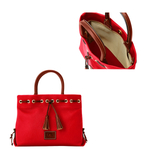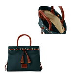 Crafted in Dooney and Bourke's signature pebble leather, this softly structure tote is detailed with contrasting Vacchetta leather trim and finished with a tassel tie. Features include three inside slip pockets, cell phone pocket, inside key hook, line, adjustable, detachable strap. Strap drop length 26 inches. Handle drop length 4.5 inches. Measures H 9 in x W 12 in x D 5 in.