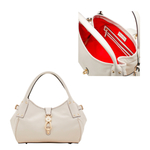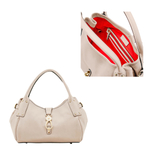 Unstructured shapes and tumbled, pebbled leather give a visual and tactile softness to this modern, compact satchel. A refined, jewel-inspired lock adorns this design, while keeping your essentials secureârefined style. Features include double handles, logo lock closure, adjustable side buckles, four bottom feet, goldtone hardware, inside slip pocket, cell phone pocket, one inside zip pocket, and an internal key hook. 7.5 inch handle drop. Measures H 8 in x W 13 in x D 6 in.